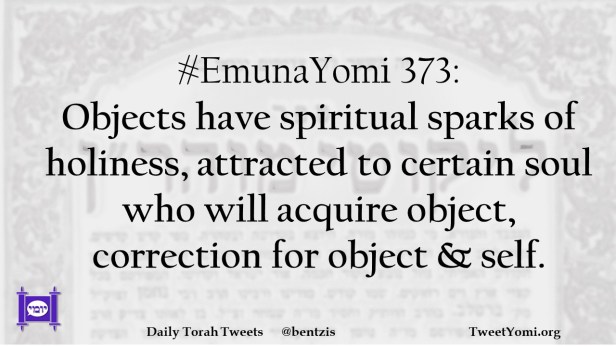 #EmunaYomi 373: Objects have spiritual sparks of holiness, attracted to certain soul who will acquire object, correction for object & self.