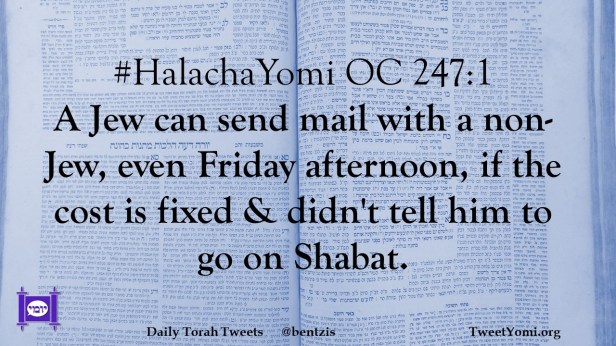 #HalachaYomi OC 247:1 A Jew can send mail with a non-Jew, even Friday afternoon, if the cost is fixed & didn’t tell him to go on Shabat.
