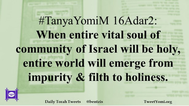 #TanyaYomiM 16Adar2: When entire vital soul of community of Israel will be holy, entire world will emerge from impurity & filth to holiness.