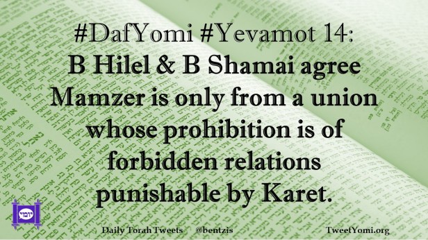 DafYomi, Yevamot #DafYomi #Yevamot 14 Date: March 23, 2022Author: ysspitz #DafYomi #Yevamot 14: B Hilel & B Shamai agree Mamzer is only from a union whose prohibition is of forbidden relations punishable by Karet. Share this: Share on X (Opens in new window) X Share on Facebook (Opens in new window) Facebook Like Loading... Related