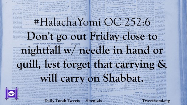 #HalachaYomi OC 252:6 Don’t go out Friday close to nightfall w/ needle in hand or quill, lest forget that carrying & will carry on Shabbat.