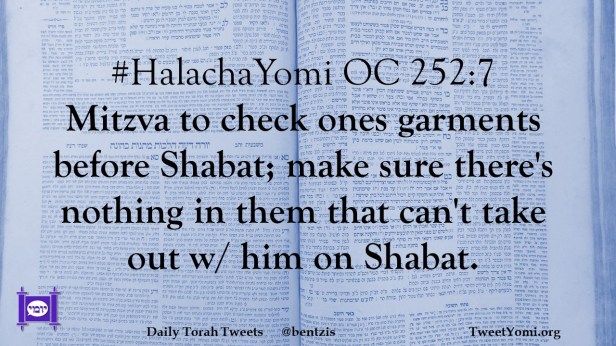 #HalachaYomi OC 252:7 Mitzva to check ones garments before Shabat; make sure there’s nothing in them that can’t take out w/ him on Shabat.
