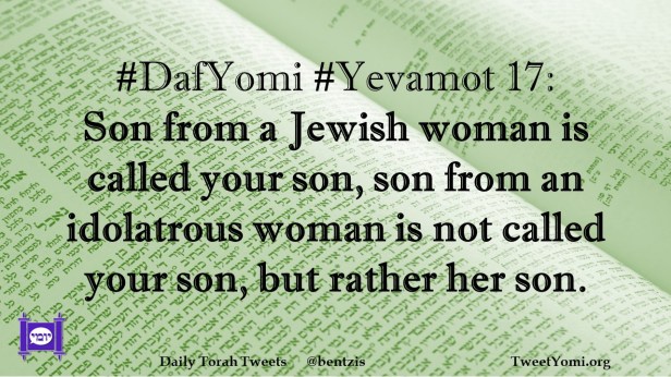 DafYomi, Yevamot ot 17 Date: March 27, 2022Author: ysspitz #DafYomi #Yevamot 17: Son from a Jewish woman is called your son, son from an idolatrous woman is not called your son, but rather her son. Share this: Share on X (Opens in new window) X Share on Facebook (Opens in new window) Facebook Like Loading... Related