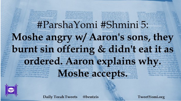 #ParshaYomi #Shmini 5: Moshe angry w/ Aaron’s sons, they burnt sin offering & didn’t eat it as ordered. Aaron explains why. Moshe accepts.