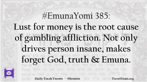 #EmunaYomi 385: Lust for money is the root cause of gambling affliction. Not only drives person insane, makes forget God, truth & Emuna.