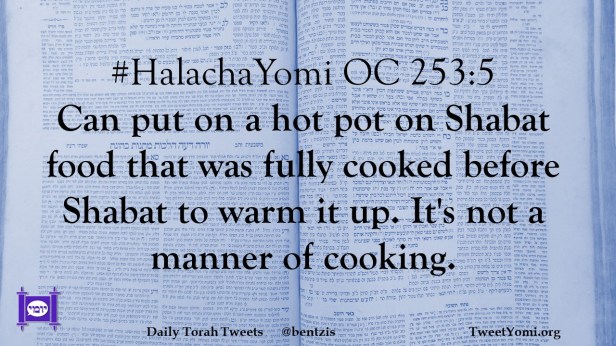 #HalachaYomi OC 253:5 Can put on a hot pot on Shabat food that was fully cooked before Shabat to warm it up. It’s not a manner of cooking.