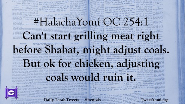 #HalachaYomi OC 254:1 Can’t start grilling meat right before Shabat, might adjust coals. But ok for chicken, adjusting coals would ruin it.