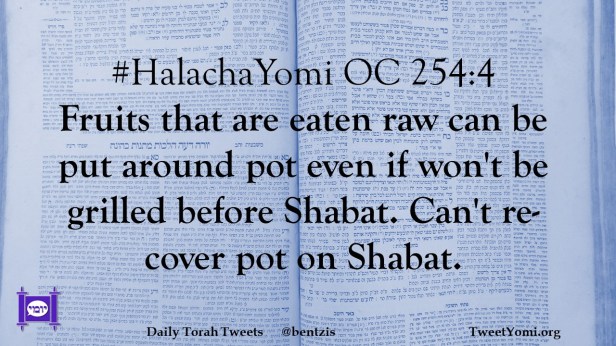 #HalachaYomi OC 254:4 Fruits that are eaten raw can be put around pot even if won’t be grilled before Shabat. Can’t re-cover pot on Shabat.
