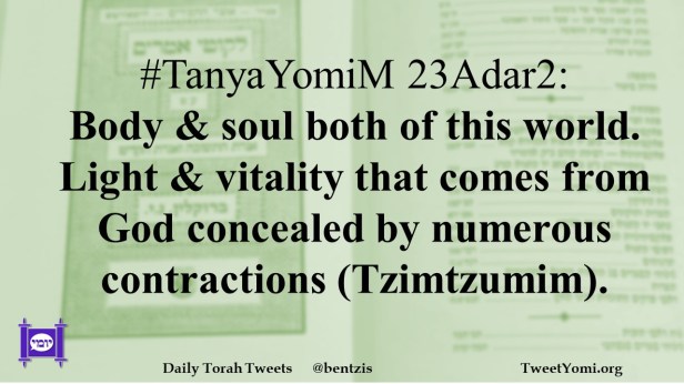 #TanyaYomiM 23Adar2: Body & soul both of this world. Light & vitality that comes from God concealed by numerous contractions (Tzimtzumim).