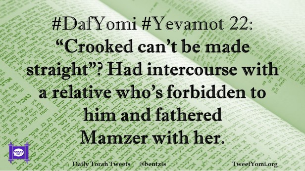 DafYomi, Yevamot #DafYomi #Yevamot 22 Date: March 29, 2022Author: ysspitz #DafYomi #Yevamot 22: “Crooked can’t be made straight”? Had intercourse with a relative who’s forbidden to him and fathered Mamzer with her. Share this: Share on X (Opens in new window) X Share on Facebook (Opens in new window) Facebook Like Loading... Related