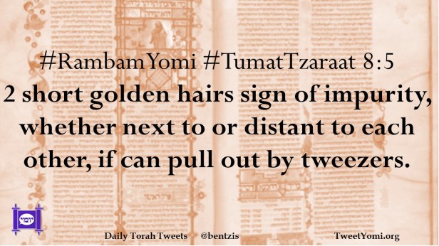 #RambamYomi #TumatTzaraat 8:5 2 short golden hairs sign of impurity, whether next to or distant to each other, if can pull out by tweezers.