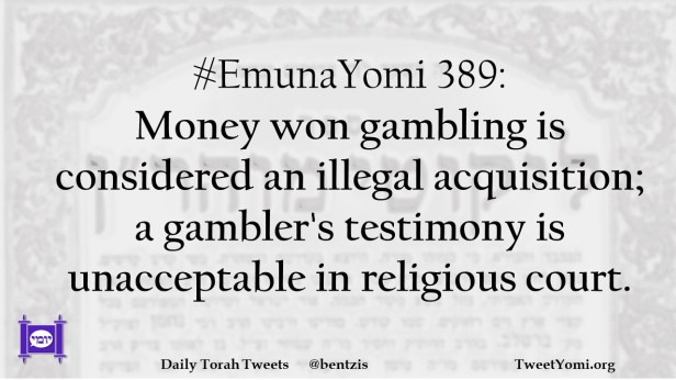 #EmunaYomi 389: Money won gambling is considered an illegal acquisition; a gambler’s testimony is unacceptable in religious court.