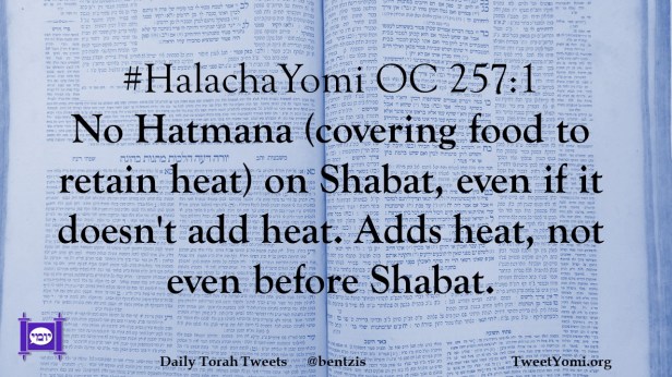 #HalachaYomi OC 257:1 No Hatmana (covering food to retain heat) on Shabat, even if it doesn’t add heat. Adds heat, not even before Shabat.