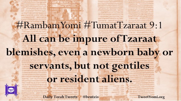#RambamYomi #TumatTzaraat 9:1 All can be impure of Tzaraat blemishes, even a newborn baby or servants, but not gentiles or resident aliens.