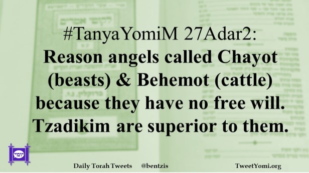 #TanyaYomiM 27Adar2: Reason angels called Chayot (beasts) & Behemot (cattle) because they have no free will. Tzadikim are superior to them.