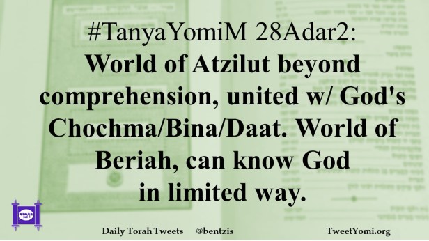#TanyaYomiM 28Adar2: World of Atzilut beyond comprehension, united w/ God’s Chochma/Bina/Daat. World of Beriah, can know God in limited way.