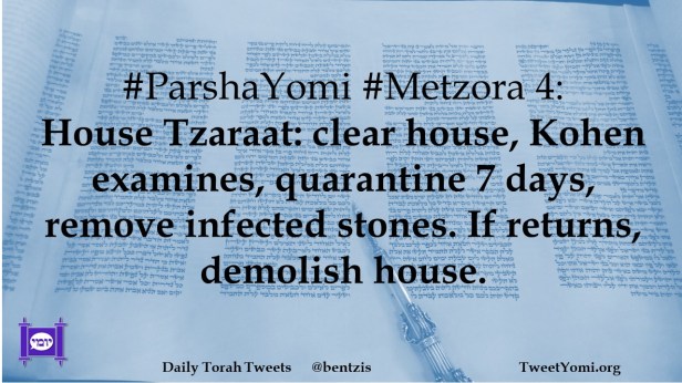 #ParshaYomi #Metzora 4: House Tzaraat: clear house, Kohen examines, quarantine 7 days, remove infected stones. If returns, demolish house.