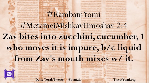 #RambamYomi #MetameiMishkavUmoshav 2:4 Zav bites into zucchini, cucumber, 1 who moves it is impure, b/c liquid from Zav’s mouth mixes w/ it.
