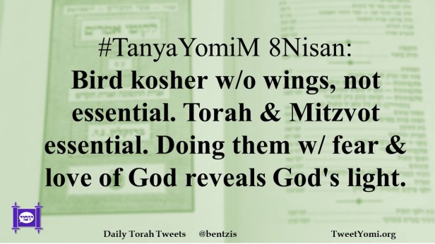 #TanyaYomiM 8Nisan: Bird kosher w/o wings, not essential. Torah & Mitzvot essential. Doing them w/ fear & love of God reveals God’s light.