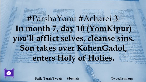 #ParshaYomi #Acharei 3: In month 7, day 10 (YomKipur) you’ll afflict selves, cleanse sins. Son takes over KohenGadol, enters Holy of Holies.