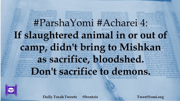 #ParshaYomi #Acharei 4: If slaughtered animal in or out of camp, didn’t bring to Mishkan as sacrifice, bloodshed. Don’t sacrifice to demons.