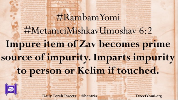 #RambamYomi #MetameiMishkavUmoshav 6:2 Impure item of Zav becomes prime source of impurity. Imparts impurity to person or Kelim if touched.