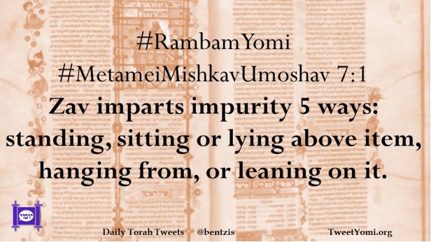 #RambamYomi #MetameiMishkavUmoshav 7:1 Zav imparts impurity 5 ways: standing, sitting or lying above item, hanging from, or leaning on it.