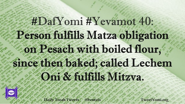 DafYomi, Yevamot #DafYomi #Yevamot 40 Date: April 28, 2022Author: ysspitz #DafYomi #Yevamot 40: Person fulfills Matza obligation on Pesach with boiled flour, since then baked; called Lechem Oni & fulfills Mitzva. Share this: Share on X (Opens in new window) X Share on Facebook (Opens in new window) Facebook Like Loading... Related