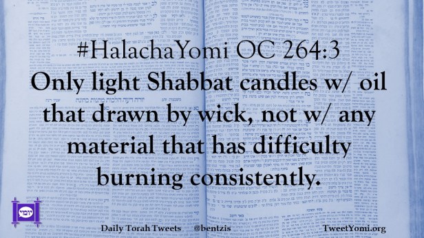 #HalachaYomi OC 264:3 Only light Shabbat candles w/ oil that drawn by wick, not w/ any material that has difficulty burning consistently.