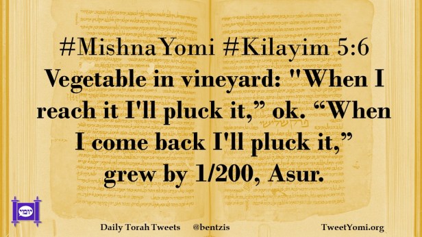 #MishnaYomi #Kilayim 5:6 Vegetable in vineyard: “When I reach it I’ll pluck it,” ok. “When I come back I’ll pluck it,” grew by 1/200, Asur.