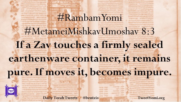 #RambamYomi #MetameiMishkavUmoshav 8:3 If a Zav touches a firmly sealed earthenware container, it remains pure. If moves it, becomes impure.