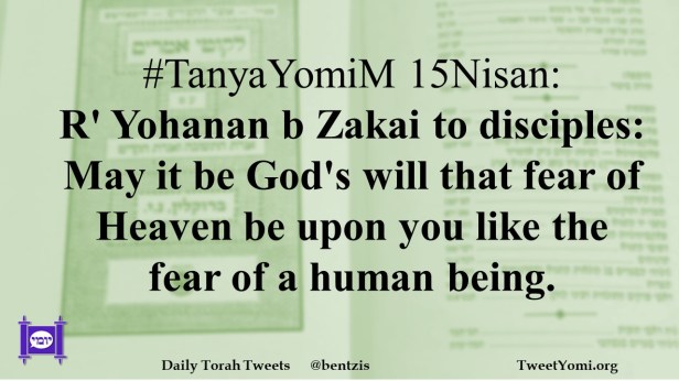 #TanyaYomiM 15Nisan: R’ Yohanan b Zakai to disciples: May it be God’s will that fear of Heaven be upon you like the fear of a human being.