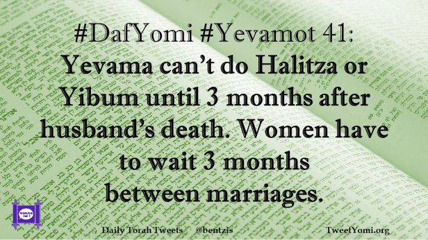DafYomi, Yevamot #DafYomi #Yevamot 41 Date: May 6, 2022Author: ysspitz #DafYomi #Yevamot 41: Yevama can’t do Halitza or Yibum until 3 months after husband’s death. Women have to wait 3 months between marriages. Share this: Share on X (Opens in new window) X Share on Facebook (Opens in new window) Facebook Like Loading... Related
