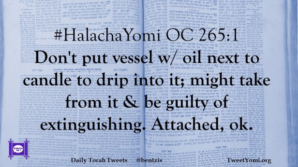 #HalachaYomi OC 265:1 Don’t put vessel w/ oil next to candle to drip into it; might take from it & be guilty of extinguishing. Attached, ok.