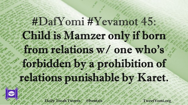 DafYomi, Yevamot #DafYomi #Yevamot 45 Date: May 10, 2022Author: ysspitz #DafYomi #Yevamot 45: Child is Mamzer only if born from relations w/ one who’s forbidden by a prohibition of relations punishable by Karet. Share this: Share on X (Opens in new window) X Share on Facebook (Opens in new window) Facebook Like Loading... Related
