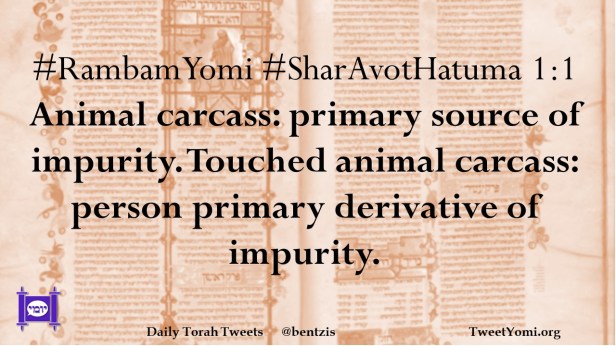 #RambamYomi #SharAvotHatuma 1:1 Animal carcass: primary source of impurity. Touched animal carcass: person primary derivative of impurity.