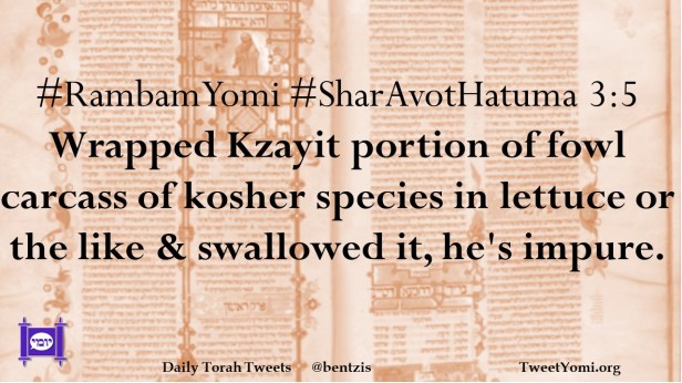#RambamYomi #SharAvotHatuma 3:5 Wrapped Kzayit portion of fowl carcass of kosher species in lettuce or the like & swallowed it, he’s impure.