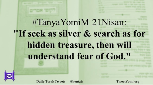 TanyaYomiM #TanyaYomiM 21Nisan Date: May 10, 2022Author: ysspitz #TanyaYomiM 21Nisan: “If seek as silver & search as for hidden treasure, then will understand fear of God.” Share this: Share on X (Opens in new window) X Share on Facebook (Opens in new window) Facebook Like Loading... Related
