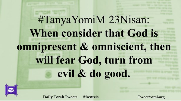 TanyaYomiM #TanyaYomiM 23Nisan Date: May 13, 2022Author: ysspitz #TanyaYomiM 23Nisan: When consider that God is omnipresent & omniscient, then will fear God, turn from evil & do good. Share this: Share on X (Opens in new window) X Share on Facebook (Opens in new window) Facebook Like Loading... Related