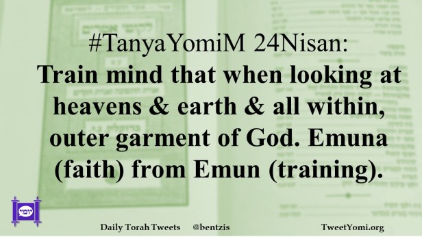 #TanyaYomiM 24Nisan: Train mind that when looking at heavens & earth & all within, outer garment of God. Emuna (faith) from Emun (training).