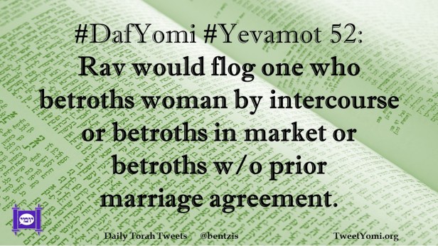 DafYomi, Yevamot #DafYomi #Yevamot 52 Date: May 17, 2022Author: ysspitz #DafYomi #Yevamot 52: Rav would flog one who betroths woman by intercourse or betroths in market or betroths w/o prior marriage agreement. Share this: Share on X (Opens in new window) X Share on Facebook (Opens in new window) Facebook Like Loading... Related