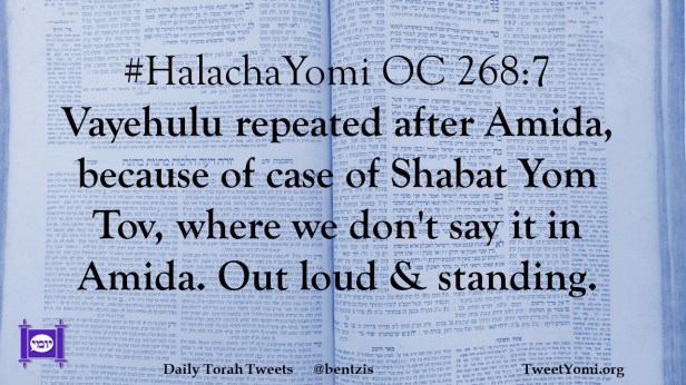 #HalachaYomi OC 268:7 Vayehulu repeated after Amida, because of case of Shabat Yom Tov, where we don’t say it in Amida. Out loud & standing.