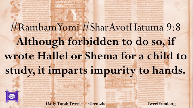 #RambamYomi #SharAvotHatuma 9:8 Although forbidden to do so, if wrote Hallel or Shema for a child to study, it imparts impurity to hands.