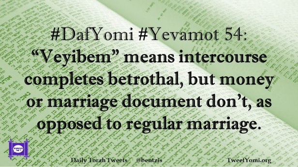DafYomi, Yevamot #DafYomi #Yevamot 54 Date: May 22, 2022Author: ysspitz #DafYomi #Yevamot 54: “Veyibem” means intercourse completes betrothal, but money or marriage document don’t, as opposed to regular marriage. Share this: Share on X (Opens in new window) X Share on Facebook (Opens in new window) Facebook Like Loading... Related