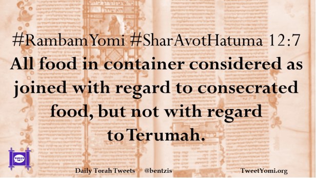 #RambamYomi #SharAvotHatuma 12:7 All food in container considered as joined with regard to consecrated food, but not with regard to Terumah.
