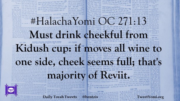 #HalachaYomi OC 271:13 Must drink cheekful from Kidush cup: if moves all wine to one side, cheek seems full; that’s majority of Reviit.