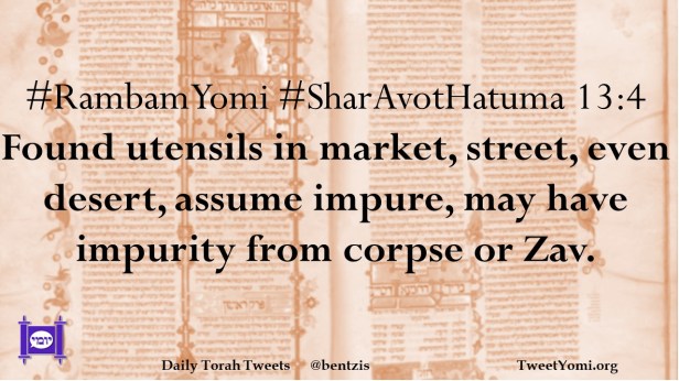 #RambamYomi #SharAvotHatuma 13:4 Found utensils in market, street, even desert, assume impure, may have impurity from corpse or Zav.