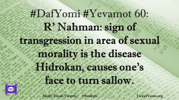 DafYomi, Yevamot #DafYomi #Yevamot 60 Date: May 24, 2022Author: ysspitz #DafYomi #Yevamot 60: R’ Nahman: sign of transgression in area of sexual morality is the disease Hidrokan, causes one’s face to turn sallow. Share this: Share on X (Opens in new window) X Share on Facebook (Opens in new window) Facebook Like Loading... Related