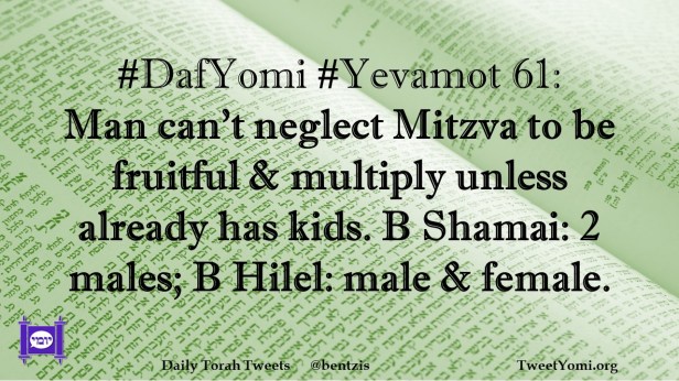 DafYomi, Yevamot #DafYomi #Yevamot 61 Date: May 24, 2022Author: ysspitz #DafYomi #Yevamot 61: Man can’t neglect Mitzva to be fruitful & multiply unless already has kids. B Shamai: 2 males; B Hilel: male & female. Share this: Share on X (Opens in new window) X Share on Facebook (Opens in new window) Facebook Like Loading... Related
