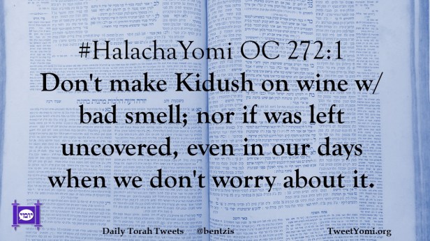 #HalachaYomi OC 272:1 Don’t make Kidush on wine w/ bad smell; nor if was left uncovered, even in our days when we don’t worry about it.